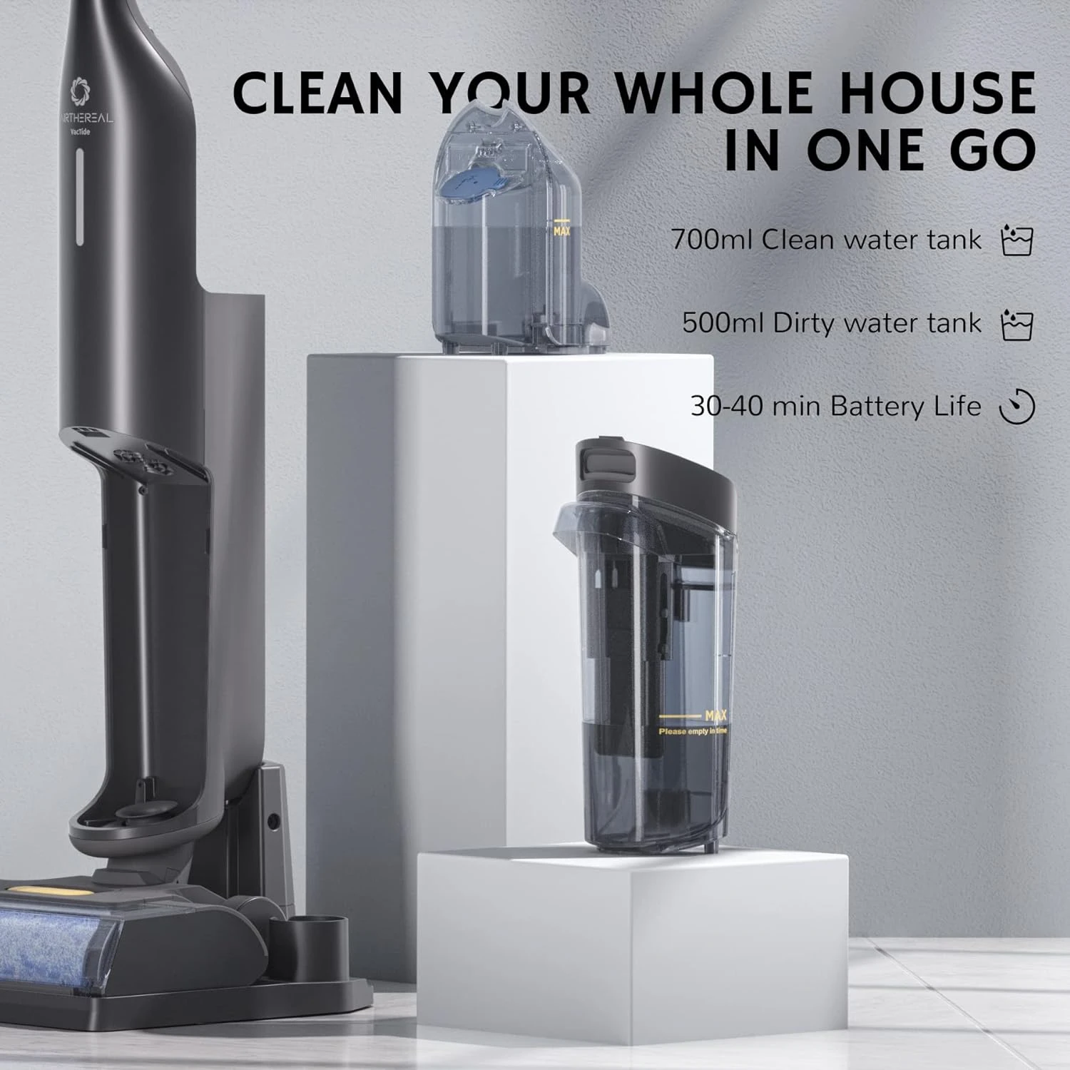 - Two-Tank Design: Separate 700ml clean water and 500ml dirty water tanks make it easy to clean your whole home with fresh solutions without refilling. You can add 12ml (about two bottle caps) of floor cleaning solution to clean water tank for deep cleaning.