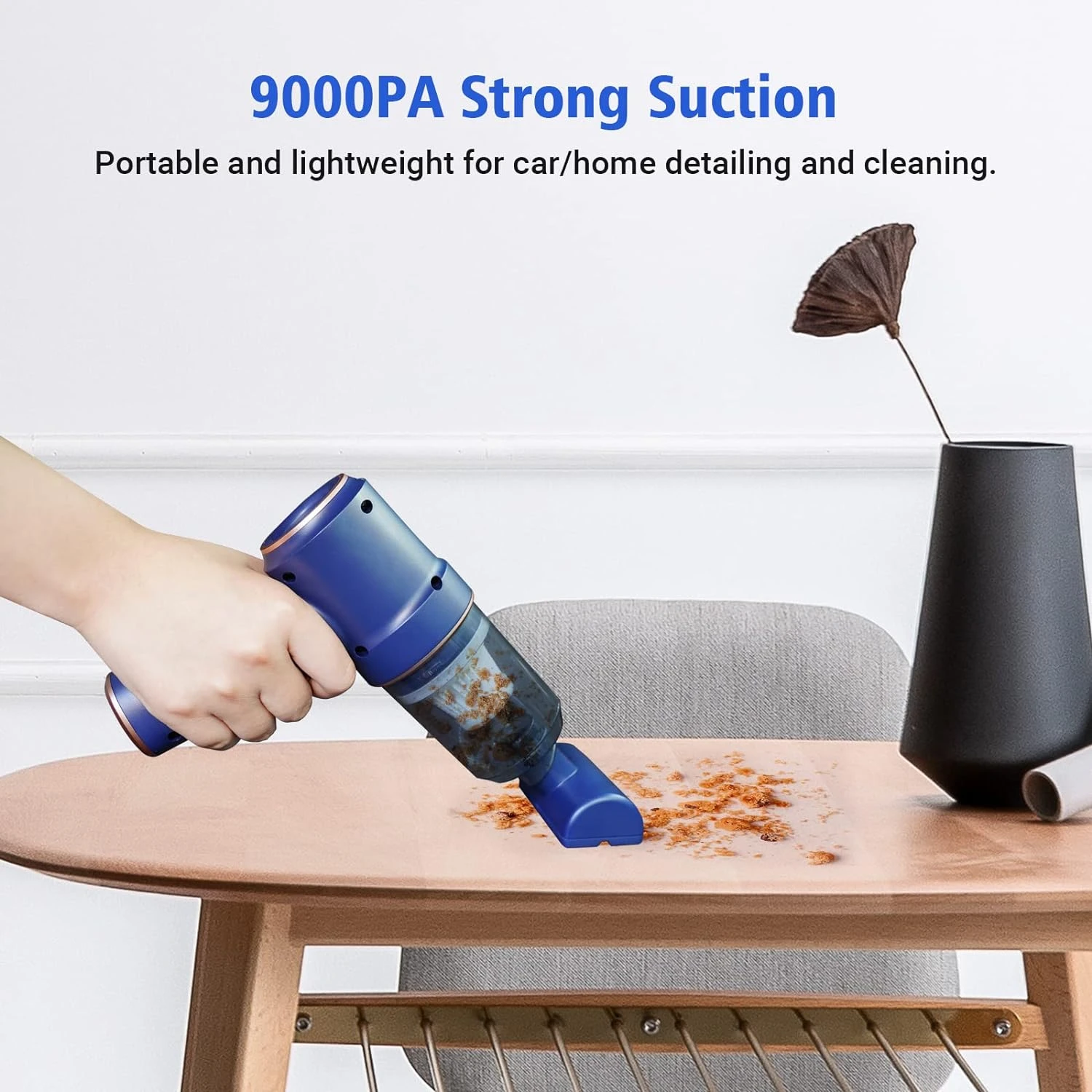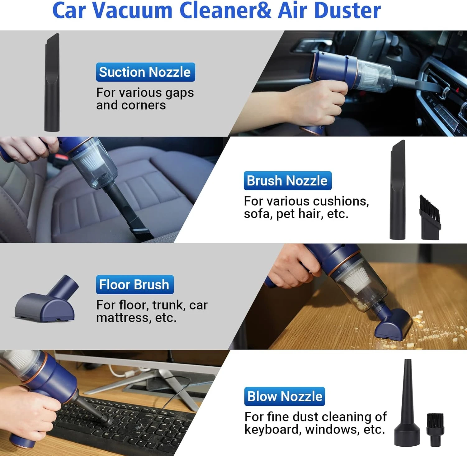 - [Vacuum Cleaner & Air Duster 2-in-1]–Addoped to advanced 2-in-1 technology of blowing and suction, this Car Vacuum Cleaner is very helpful for you. It not only can suck the dust in but also to blow them away. Our 120W high power handheld cordless vacuum has powerful suction up to 9000PA, which is enough to meet your cleaning needs for dust, debris, sand, pet hair and some difficult-to-clean debris in the car or home.
