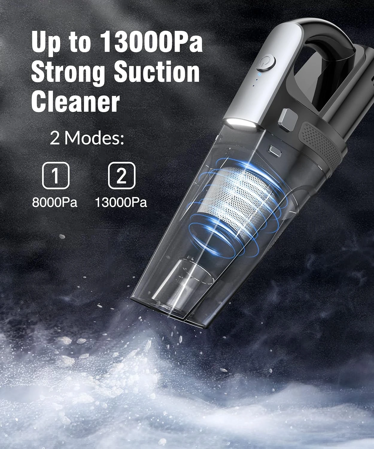 - 【13000pa Strong Suction, Efficient Cleaning】Running at strong and fade-free suction up to 13000Pa, AUTONOVO Handheld vacuum cleaner is powerful enough to pick up dirt, debris and pet hair in a single pass. Designed with two modes: 13000pa and 8000pa, this cordless handheld vacuum is an excellent all-rounder to handle different cleaning tasks properly, great for car, home and office.