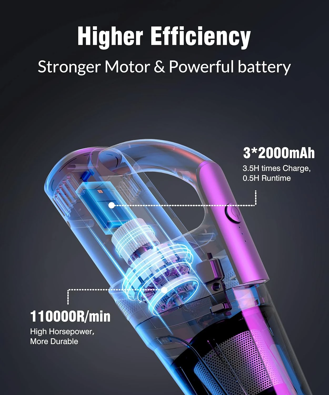- 【Big Motor, Big Battery】The high power-to-weight ratio, high speed (rpm) and torque, high efficiency, and low maintenance are advantages of a brushless DC electric motor over brushed motors. The superior core of running at 110000 rpm, would keep the 13000Pa powerful suction of handheld vacuum from decaying over time. Built-in 3x2000mAh rechargeable lithium battery, the cordless vacuum cleaner provides 30 minutes of runtime after just 3.5 hours of charging
