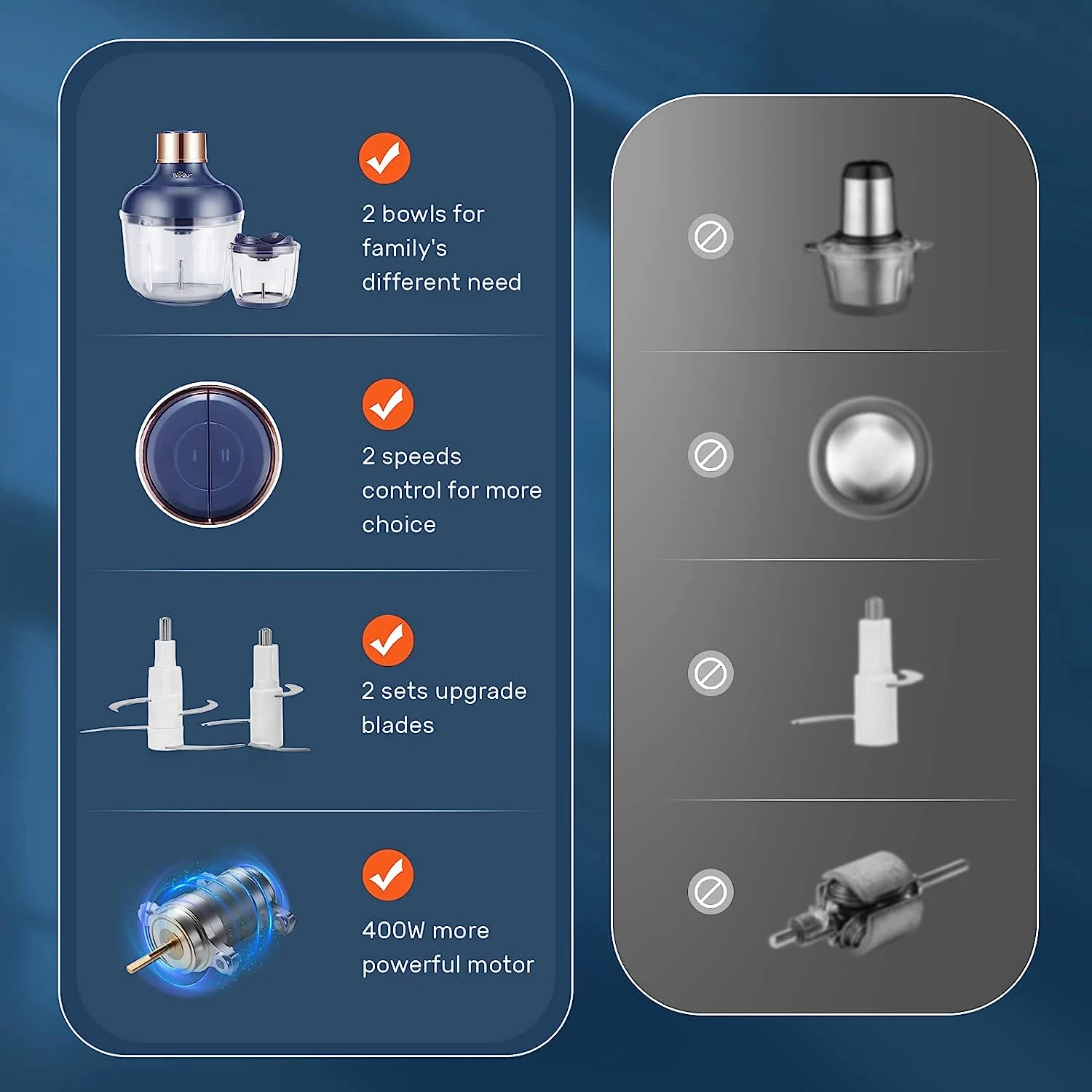 - Better Performance: With a 400W motor and sharp stainless steel blades, this food processor allows you to chop, blend, puree, mix, and mince a variety of ingredients in no time. Its unique blade design with 4 layers ensures even cutting, providing better performance compared to other food processors