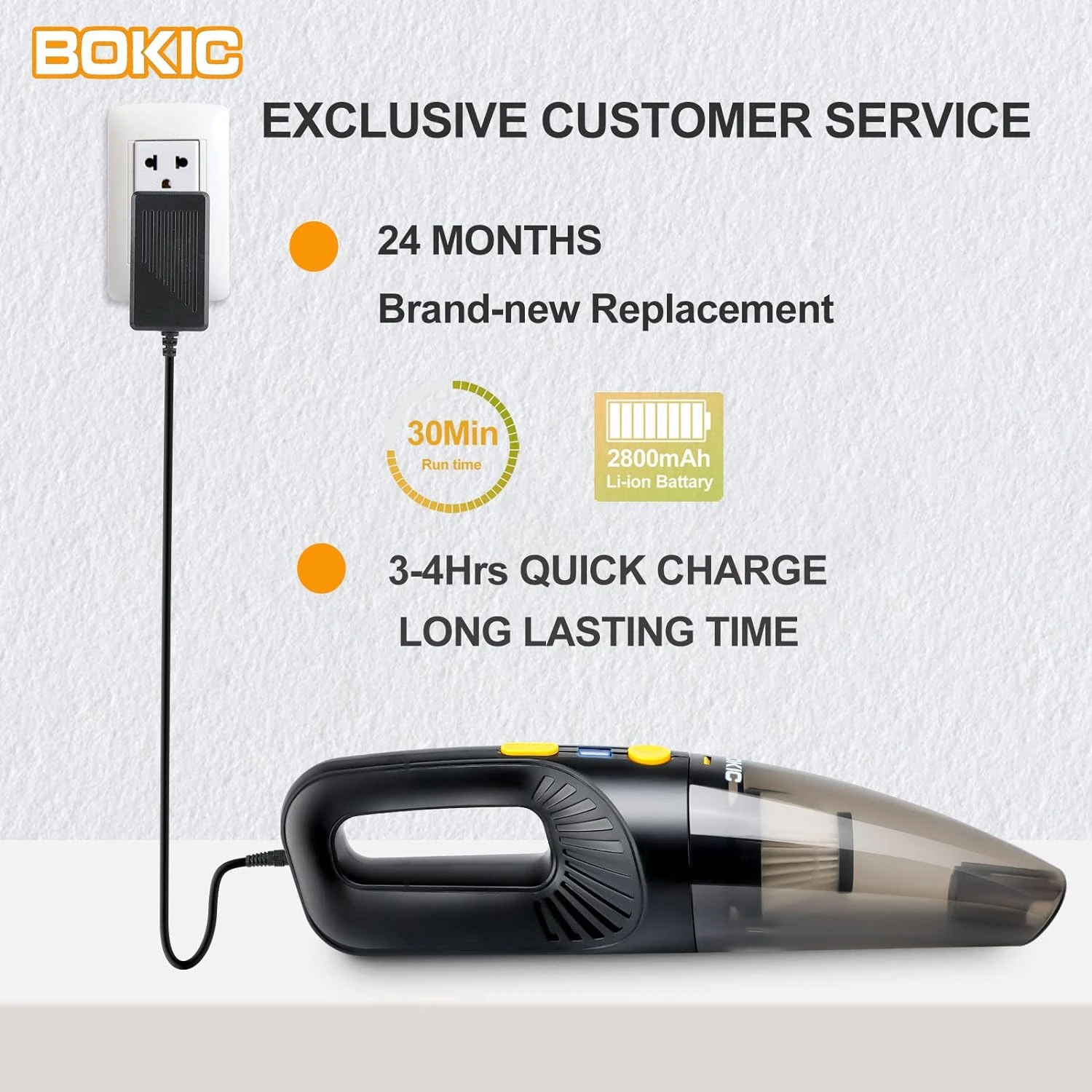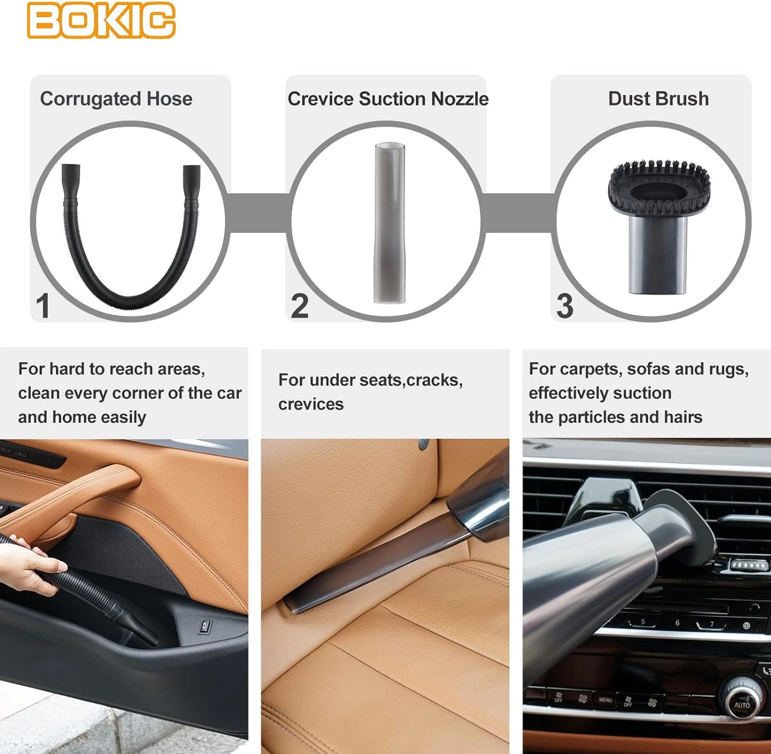 - Cordless & All-around Deep Clean-ups: BOKIC hand held cordless vacuum will be your first choice to help you clean everywhere easily without bulky and tangled cords. Our car vacuum cleaner high power cordless comes with 3 attachments, the brush for carpet dusting, the crevice nozzle for getting into tight corners and an extension soft hose for hard-to-reach areas.