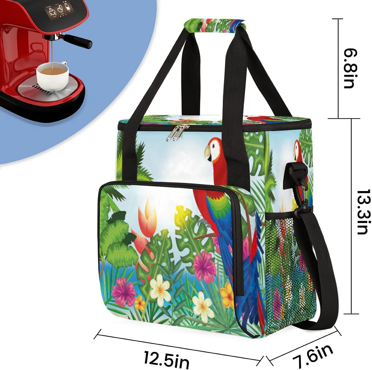 Cfpolar Coffee Maker Carrying Bag Tropical Flowers Leaves Parrot Summer Travel Coffee Machine Bag Carrying Organizer Case Portable Single Serve Coffee Brewer Tote Bag Storage Bag For Camping Picnic
