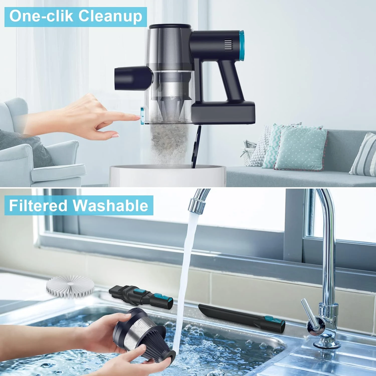 - 【5-Stage High-Efficiency Filtration & 1L Large Dustbin】Adopted 5-stage fully sealed HEPA cyclone filtration, cordless vacuum cleaner can effectively capture 99.99% of the fine dust as small as 0.1 microns, maximize locks in the tiny particles without leakage, and then bring you purified and healthy air. Large 1000ml dustbin is specially designed for multiple cleanings, and allows one click to empty.