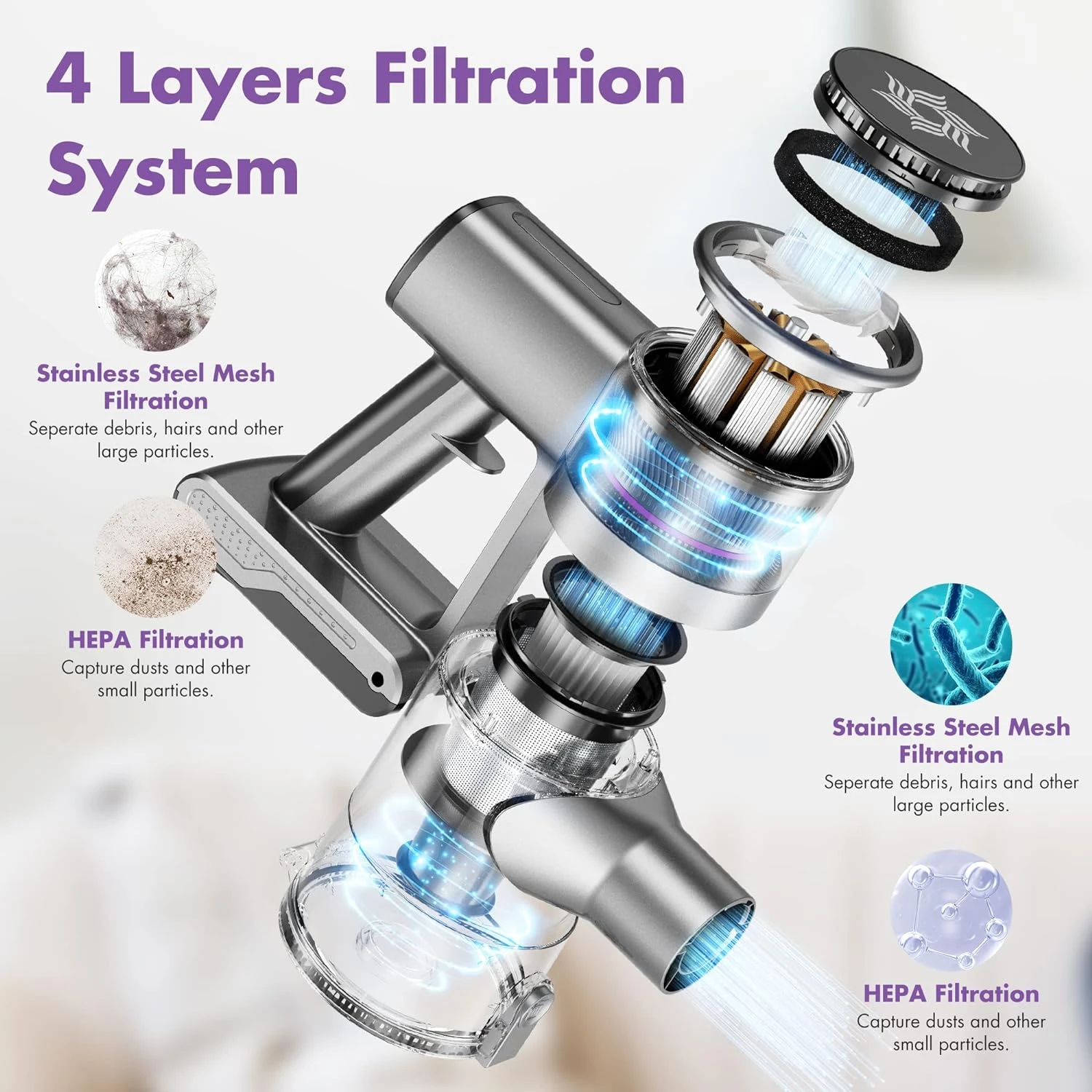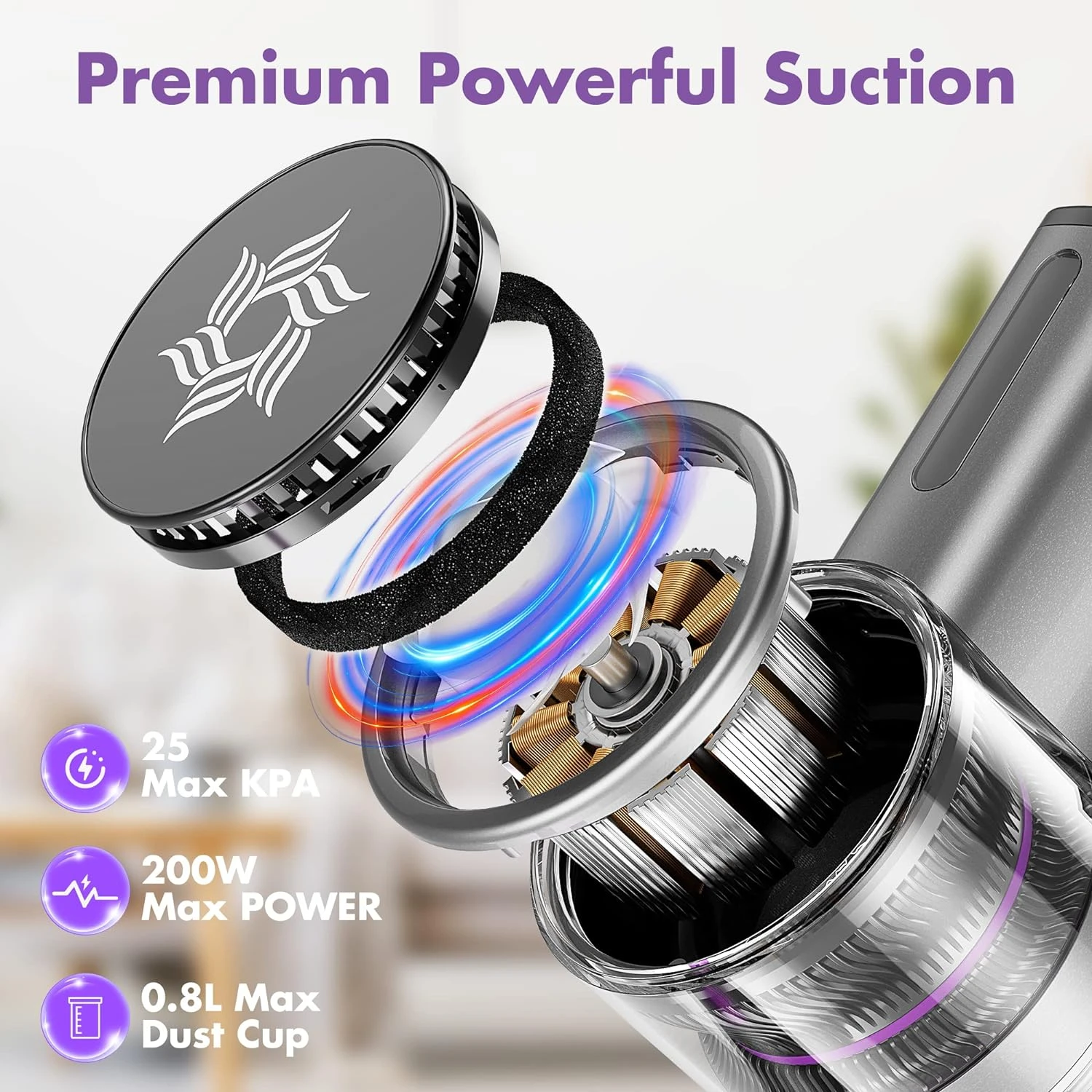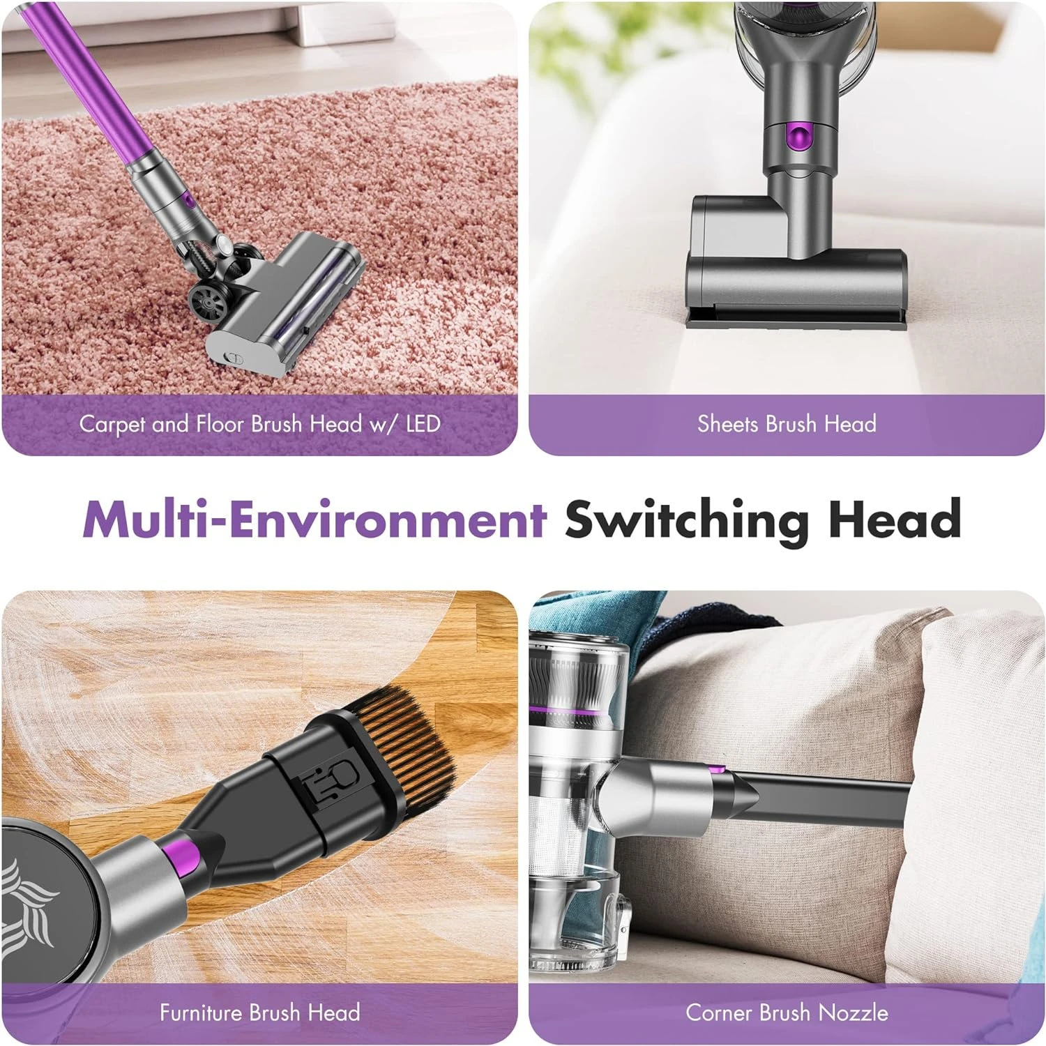 | Special Feature | ✅25Kpa Powerful Suction ✅85AW Efficient Dust Clean ✅250W Brushless Motor with 4 Cyclones ✅6*2200mAh Safety-Proof Battery ✅0.8L Extra Large Dust Cup ✅2 Auto Working Mode ✅LED Floor Brush Head ✅Anti-tangle Fluffy Brush ✅Carpet Brush ✅Oblate Nozzle for Gaps and Corners ✅Sheet and Sofa Brush Head ✅2-IN-1 Furniture Brush Head ✅Wall Hanger ✅99.99% Particle Filtration HEPA Filters ✅Stretchable Tube ✅1 Year Warranty |