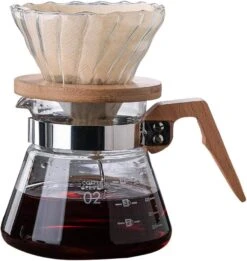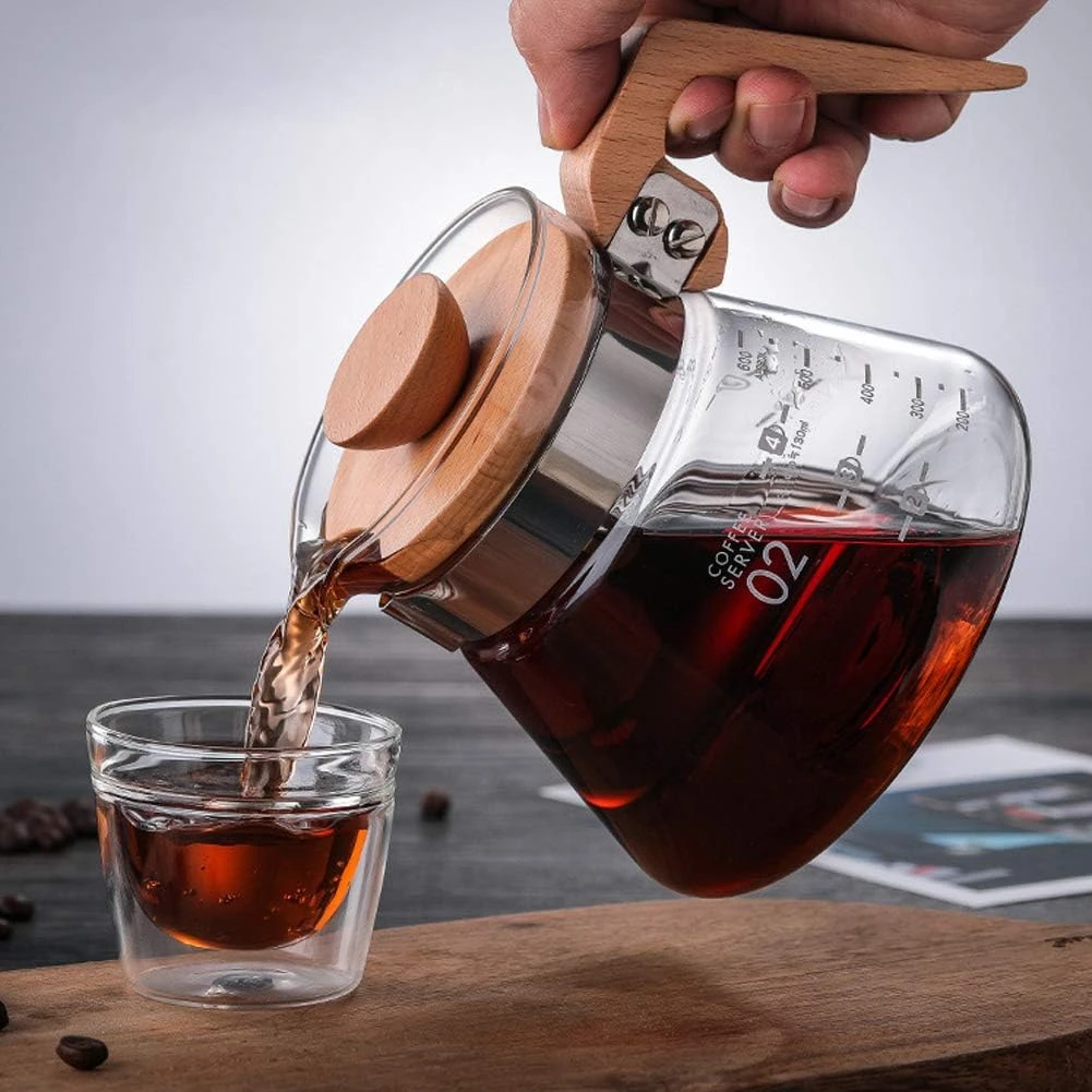 - 【Unique Design】Elegance meets practicality in this refined, DUEBEL Coffee Server with its finely featured, olive wood handle. The simple, shapely form of the glass server is tastefully complemented by the contrasting grain of the olive wood. The wooden handle has been shaped and angled for a professional pour. The accentuated angle also ensures that you don’t scald your fingers on the glass. The glass is graduated with cup markers for precision brewing.