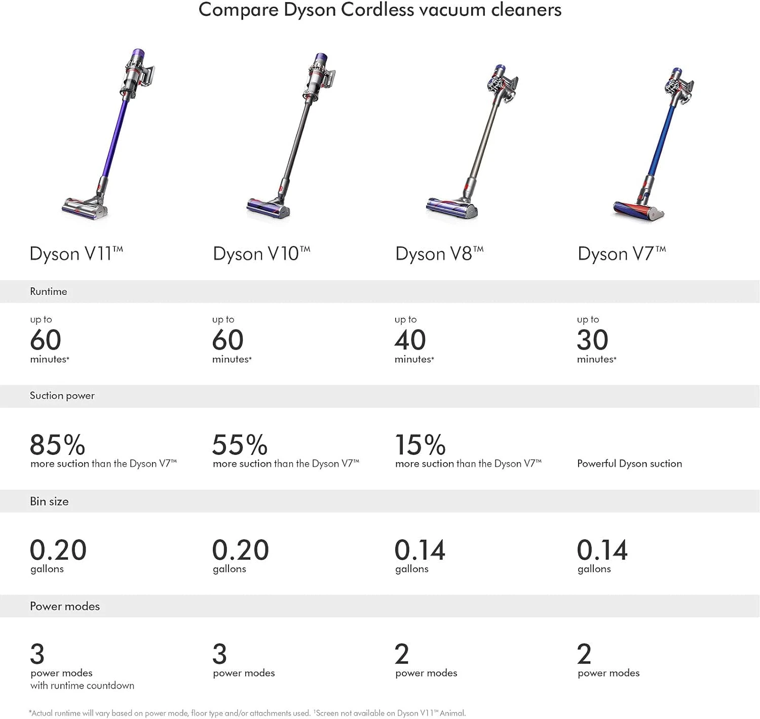 - Powered by the Dyson digital motor V10. 14 cyclones generate forces of more than 79,000g to fling microscopic particles into the bin.
