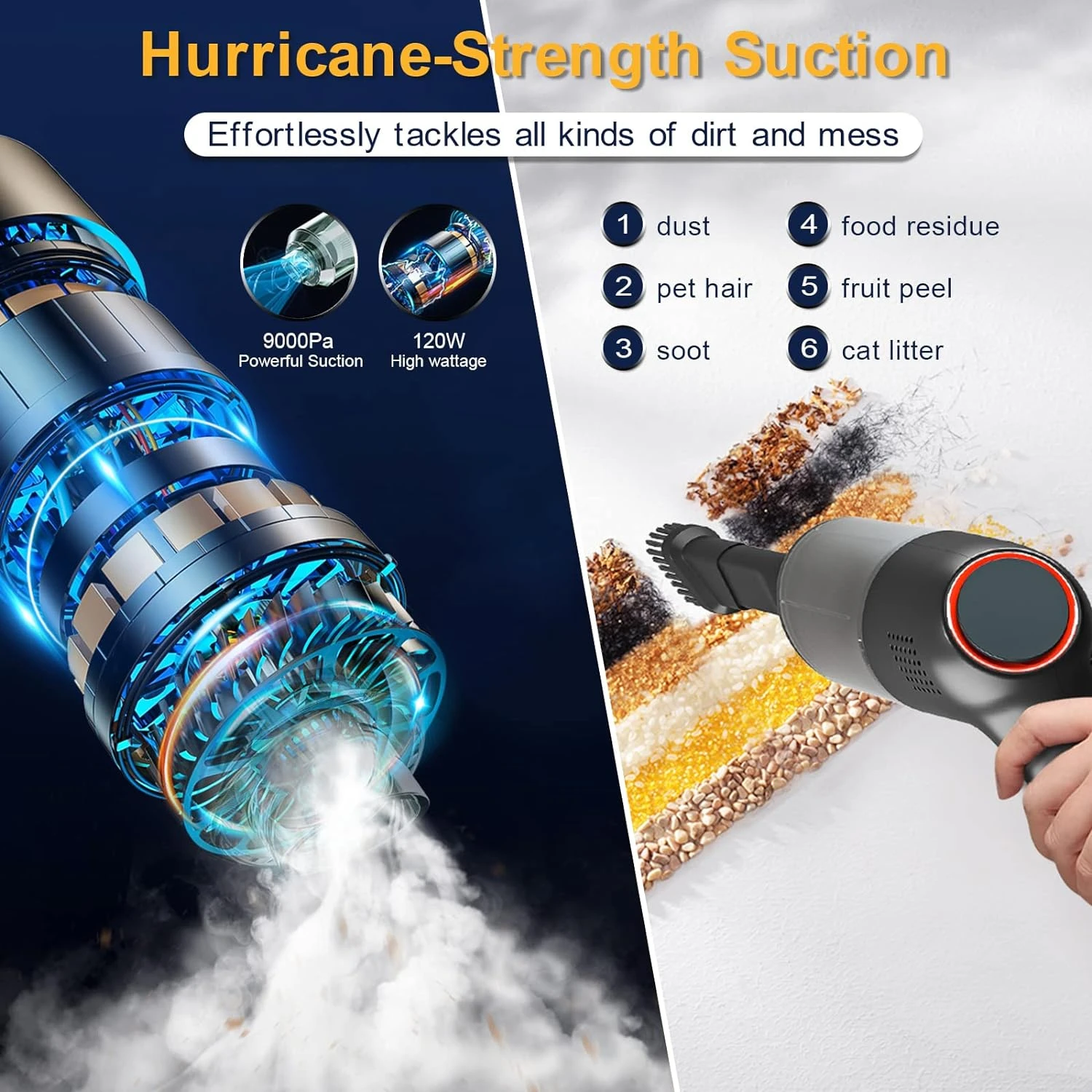 - 9000Pa STRONG SUCTION—The cordless handheld vacuum utilizes a 120w super-strong motor, provides up to 9000Pa suction power. Easily cleaning dust, crumbs and pet hair in car interior and home, like sofas, walls, stairs and other hard-to-reach places.