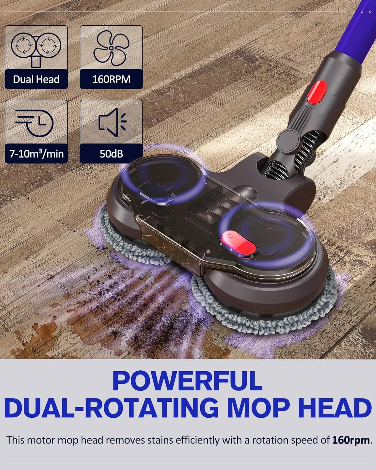 - Efficient Cleaning – This electric mop head attachment has built in 2 powerful dual motors with a speed of 160 r/min to keep mopping back and forth and remove stains effectively. It can polish and wax your floor while removing dust