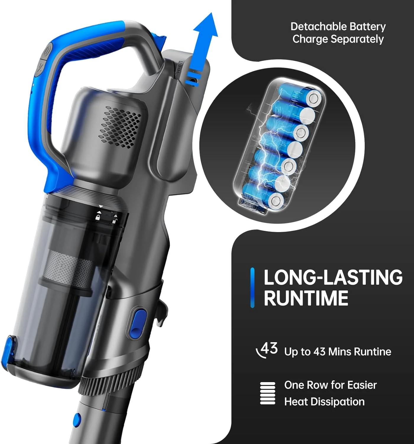 - LONG-LASTING & DETACHABLE BATTERIES : The cordless stick vacuum provides excellent cleaning performance for up to 43 minutes or more. Available in 3 power modes (low mode for 43 minutes, mid mode for 24 minutes and maximum mode for 15 minutes). Plus, the detachable battery can be charged singly or on its main body.