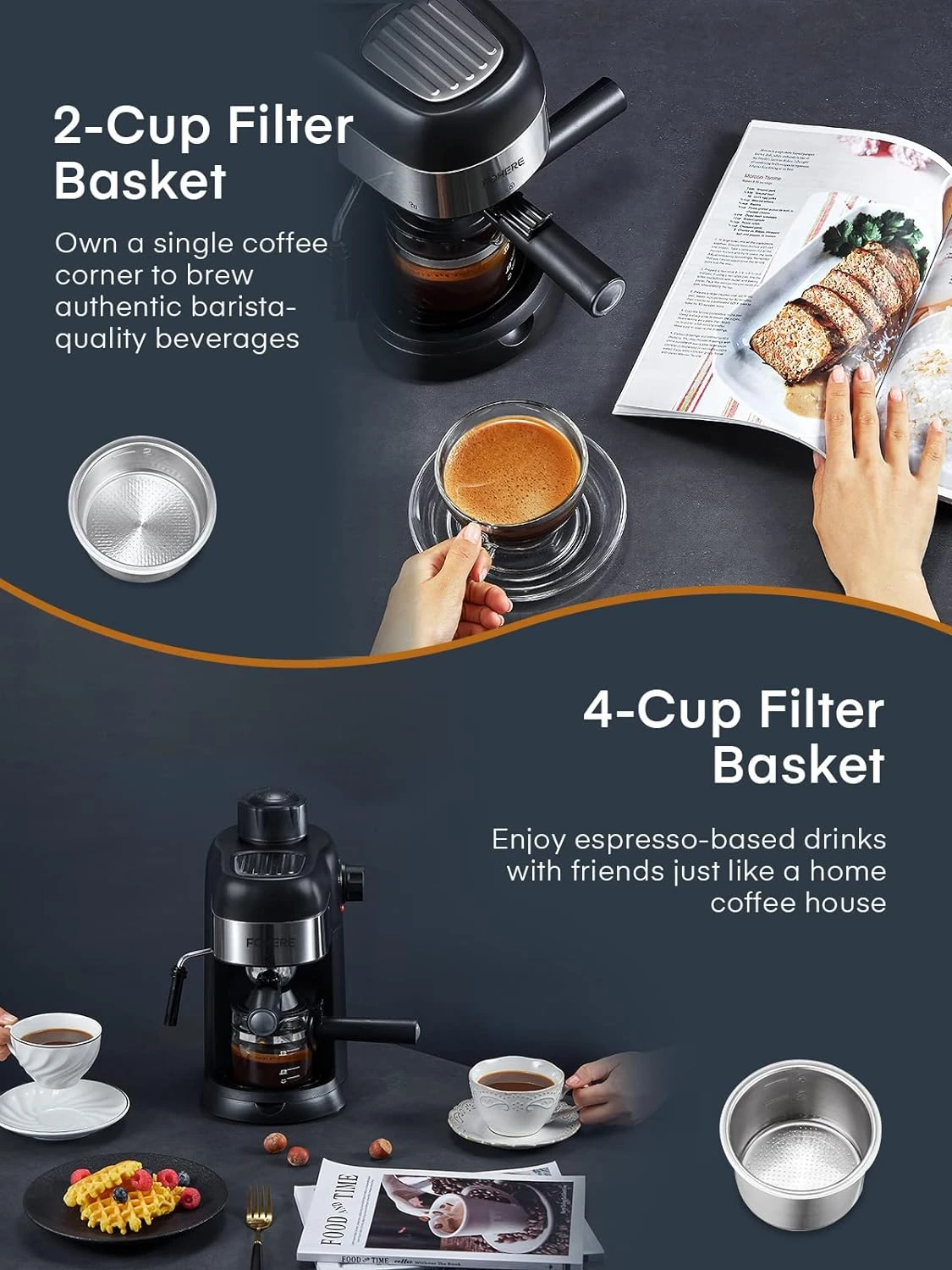 - 【Double Filter Basket】Include two filter baskets (2-cup / 4 cup) to weigh out the ideal amount of ground coffee needed, and a carafe with scale to determine the ideal amount of water needed for brewing. Using the right dose of freshly ground coffee allows the coffee to fully express the complex aroma, intense flavors and balanced taste.