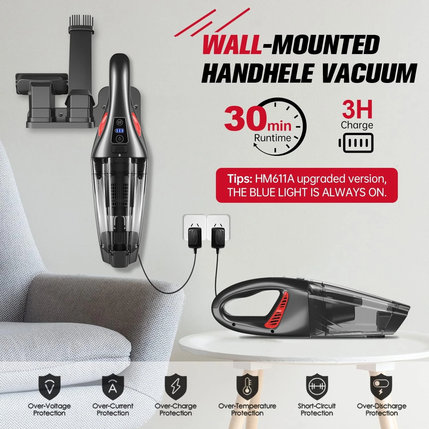 - ✅ SAFE & FAST CHARGING: The handheld vacuum cordless is equipped with a 2200mAh Li-Ion battery, 30Mins Runtime, and only takes 3 hours to charge. Provide temperature/short circuit/overvoltage/overcurrent/overcharge protection to ensure the safety of the device. It can be placed on the wall with wall-mount(included) and charge at the same time, TIME-SAVING!