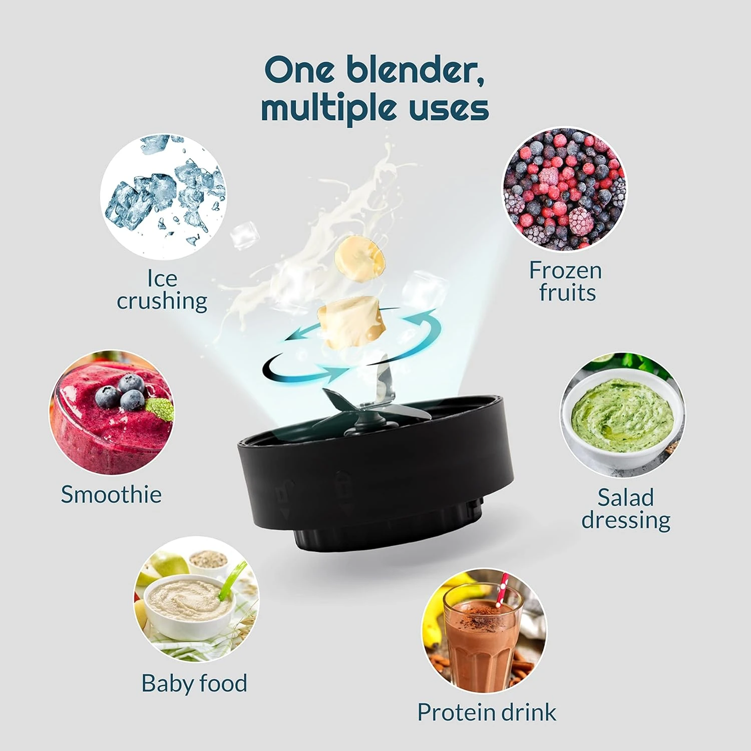 - Powerful motor & blades: Potent smoothie maker with motor of 300 watts of power and 1 speed. It has 4 stainless steel blades, ideal for slicing and dicing frozen fruit and ice-crushing.