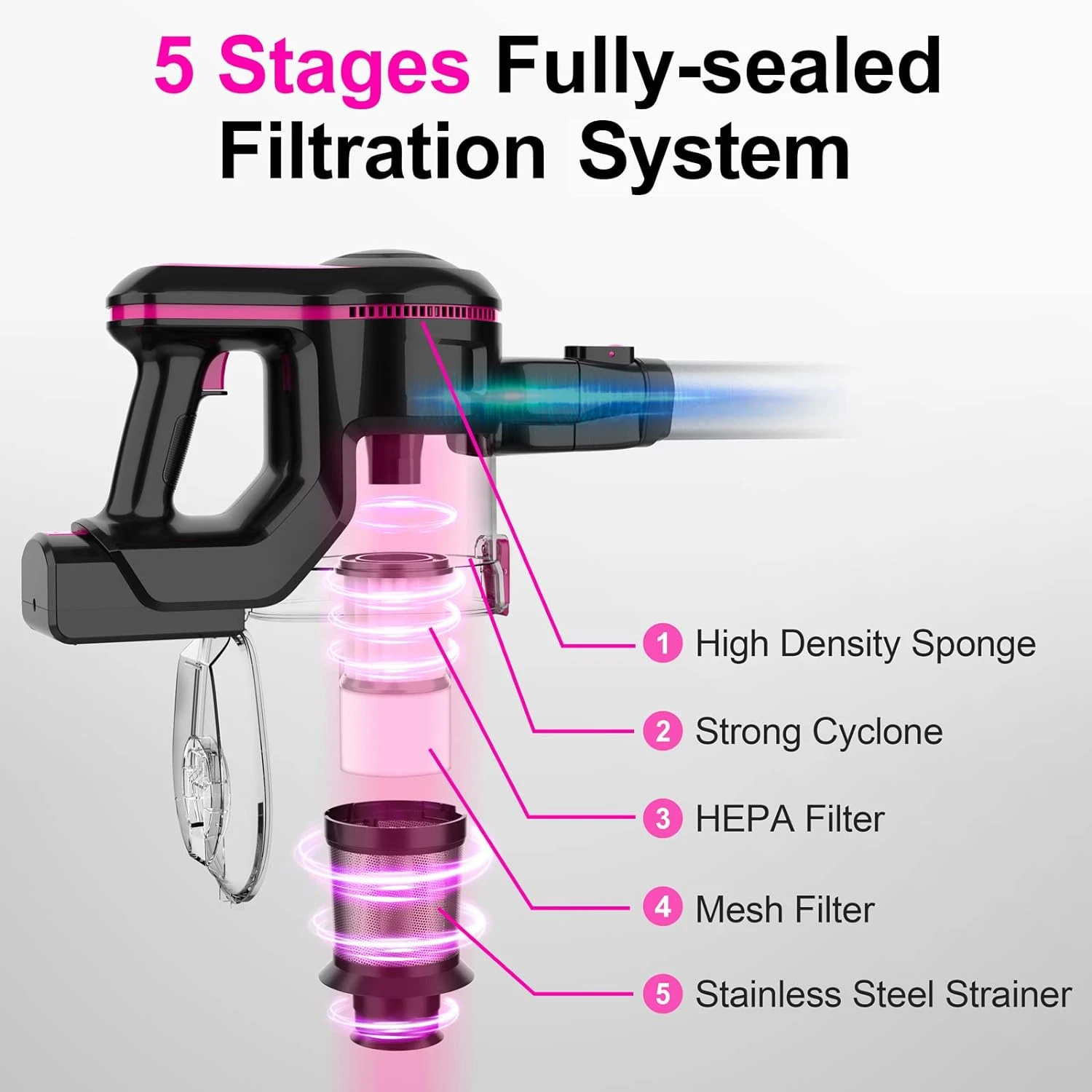 - 【5 Stages High-Efficiency Filtration System】: With 5 stages fully sealed cyclone filtration system – high-density sponge, HEPA filter, mesh filter, stainless steel strainer, and strong cyclone separation, the vacuum motor head captures 99.99% of fine particles as small as 0.1um and offers powerful centrifugal force to efficiently separate dirt.