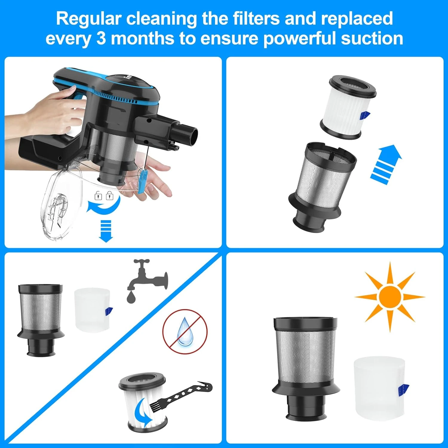 - 【HEPA filter】: The vacuum comes with a HEPA filter and metal filter which are installed in the canister. The HEPA filter is designed to block out dust and small particle, a clean HEPA helps maintain strong suction, we recommend replacing the HEPA filter every 3 months. The mesh filter around the white HEPA is necessary, please keep that on during use, DON’T put it off.