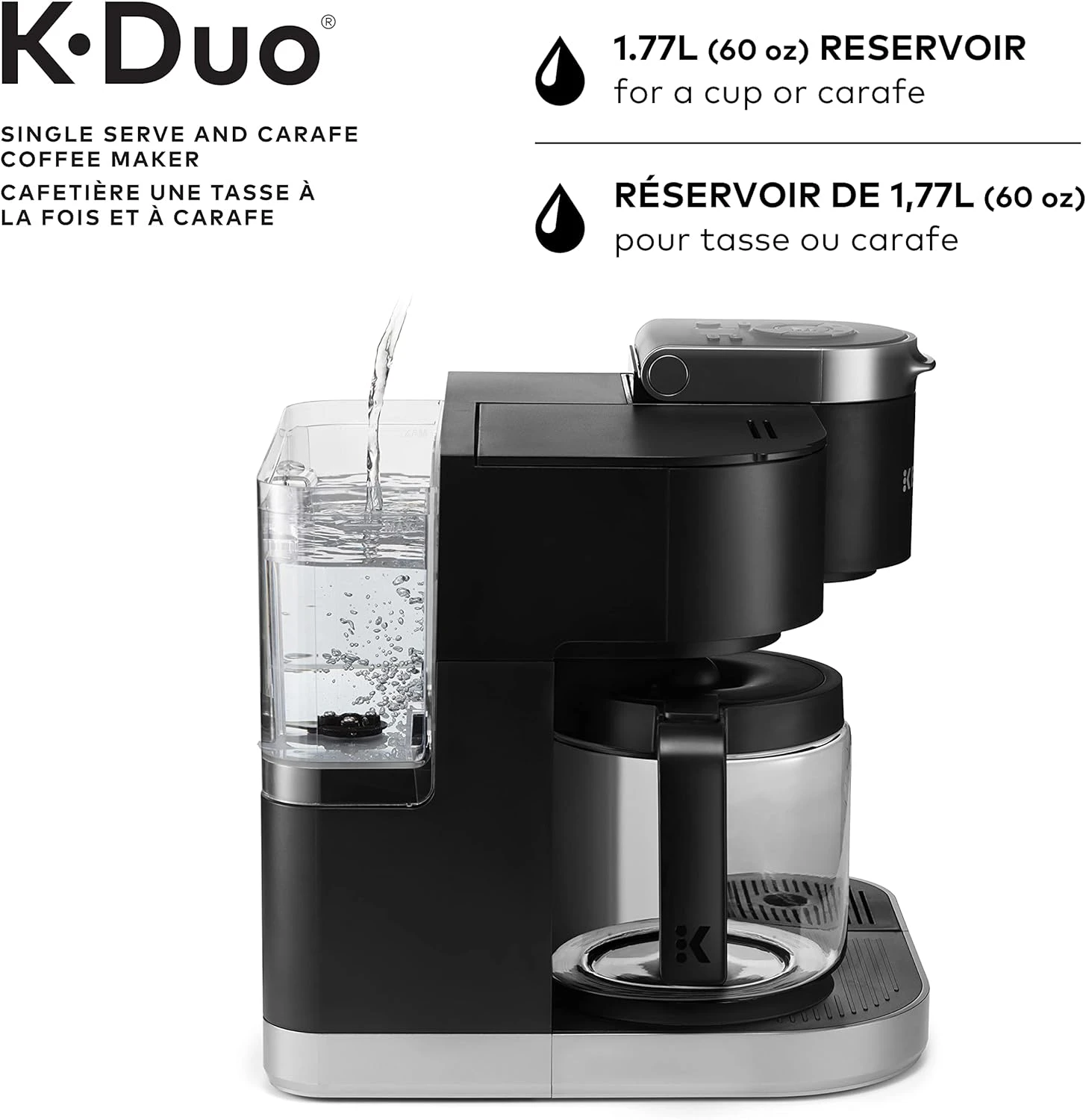 - The 1.77 L (60 oz) water reservoir is shared between the single serve and carafe brewing, saving you time, and simplifying your morning routine; removable reservoir makes refilling easy